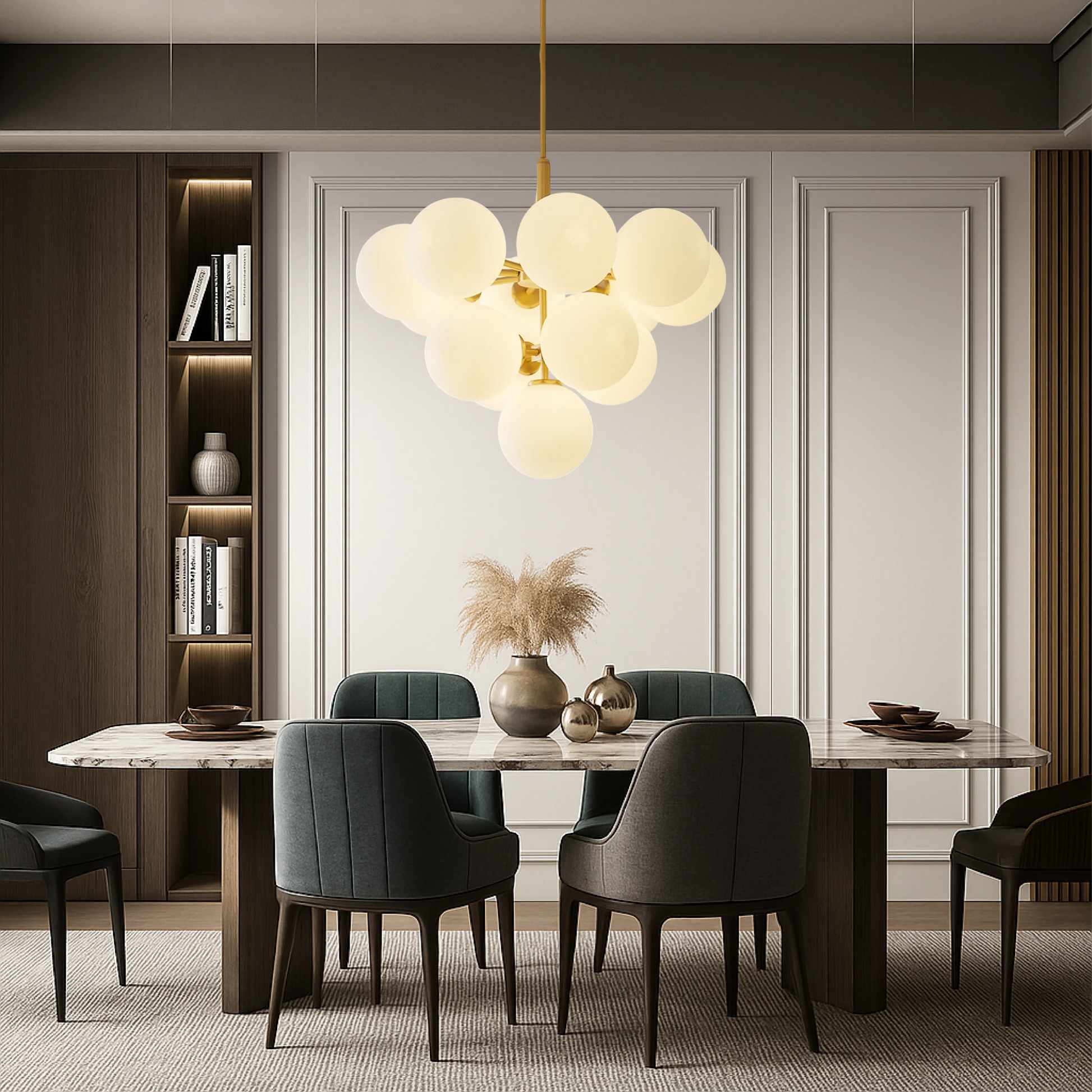 This Scandinavian chandelier with glass globes combines harmonious lines and warm lighting. The combination of metal arms and spherical glass shades creates an elegant, spacious effect in dining rooms, living rooms, or entryways with high ceilings. A true eye-catcher that combines Scandinavian minimalism with modern flair.