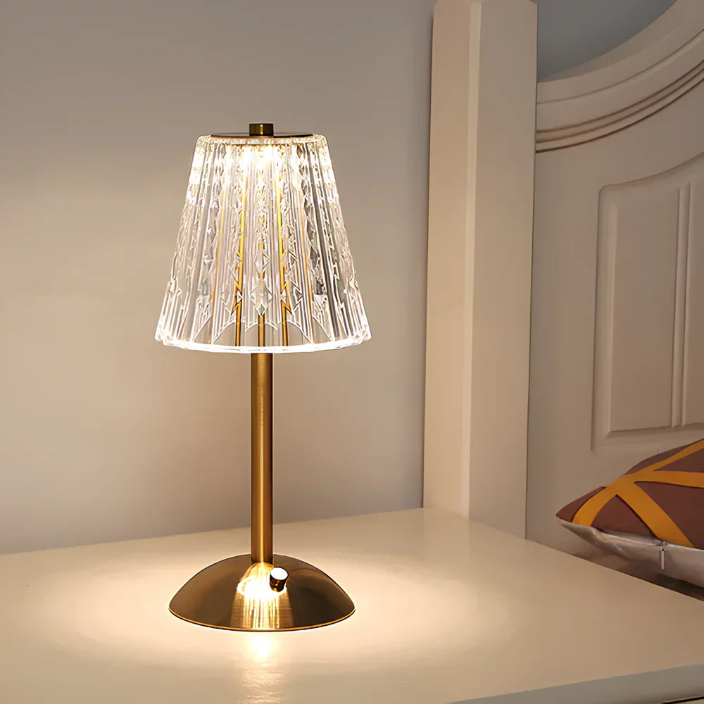 The Golden Crystal Table Lamp elegantly merges contemporary design with timeless allure. Its crystal-inspired shade casts a soft, warm glow, creating a serene ambiance. With touch-activated controls, you can effortlessly adjust the brightness and color temperature to suit your mood. The built-in rechargeable battery offers the freedom of cordless use, while the brushed finish and premium materials elevate the lamp’s sophistication, making it a refined addition to any space.
