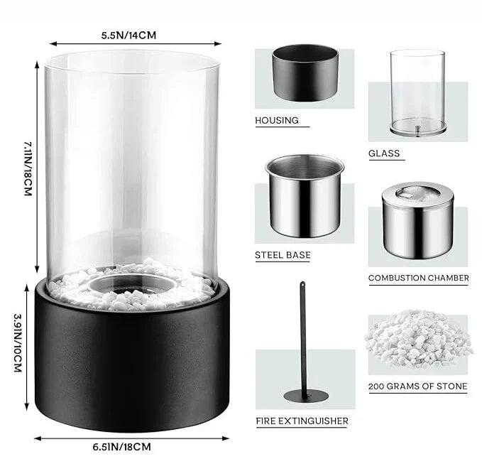Housing case, steel base, combustion chamber, glass cylinder, fire extinguisher and decoration stones.