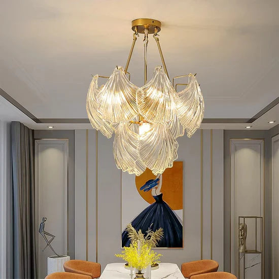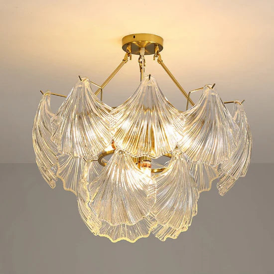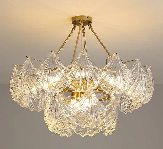 Let your interior shine with this elegant shell chandelier , designed for those who appreciate subtle luxury and dreamy lighting . The oval, gently curved glass shades provide a soft light distribution and create a serene ambiance in any room. Ideal above the dining table, in the living room, or bedroom. Crafted from high-quality metal and glass for a durable, airy look with a refined touch.